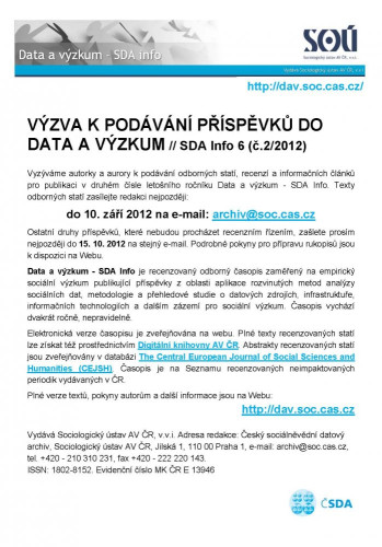 Vyzýváme autorky a aurory k podávání odborných statí, recenzí a informačních článků pro publikaci v druhém čísle letošního ročníku Data a výzkum - SDA Info. Texty odborných statí zasílejte redakci nejpozději: do 10. září 2012 na e-mail: