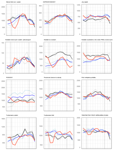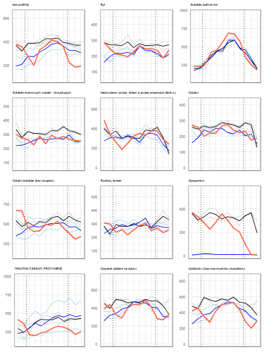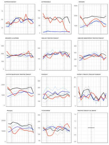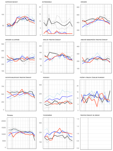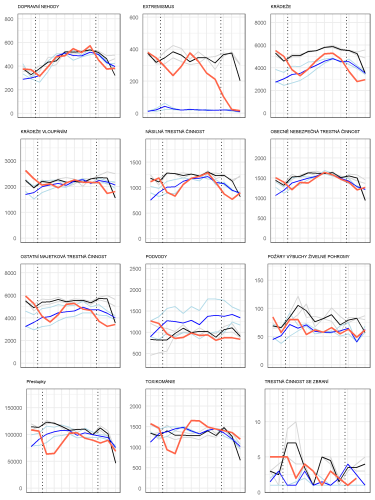 Covid-19 významně ohrozil nejen zdraví obyvatelstva a fungování zdravotnictví, ale i mnoho dalších oblastí lidského života. Epidemiologická opatření narušila běžné fungování společnosti a odrazila se i ve fungování kriminality a bezpečnostních složek. Proměny a dopady těchto omezení a opatření, zejména omezení pohybu (tzv. lockdowny), dokumentuje zpráva pomocí porovnání struktury a intenzity kriminality "před" obdobím covidu (2018-2019), "během" něj (2020) a "po" něm (2021- 2022). Využívá k tomu otevřená data PČR. Data ukazují diferencovaný vývoj u vybraných trestných činů a přestupků, který je ovlivněn změnou rutin a příležitostí pro páchání trestné činnosti v důsledku omezení pohybu obyvatel. Kriminalita vázaná na veřejný prostor poklesla, drasticky poklesly zejména krádeže na osobách. Kriminalita vázaná na kyberprostor naopak narostla, v souladu s přesunem mnoha lidských aktivit do online prostoru. Příspěvek rovněž ukazuje krátkodobé a dlouhodobé efekty v nápadu kriminality i regionální rozdíly v proměně struktury a intenzity kriminality mezi vybranými kraji.